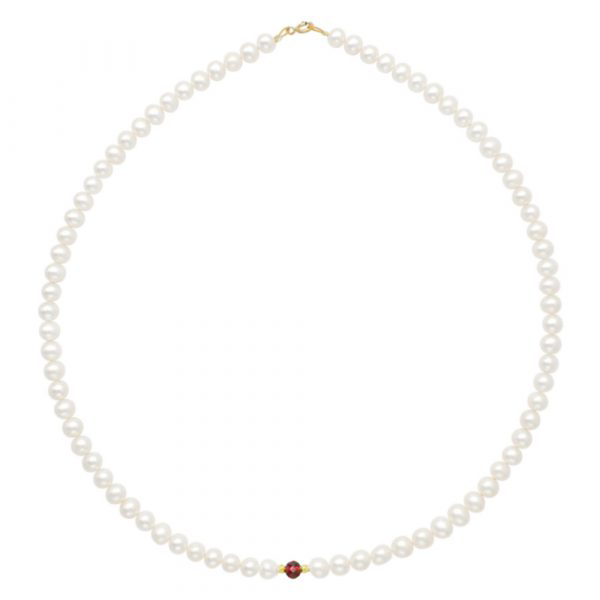 Κολιέ με λευκά μαργαριτάρια γλυκού νερού F.W.P. διαμέτρου 4-4,5 mm. Έχει χρυσό κούμπωμα ασφαλείας Κ14, μπίλιες από χρυσό Κ14, ένα κόκκινο ζιργκόν και μήκος 45 cm. Συνδυάζεται με το αναλογο βραχιόλι (κωδ. 020201)