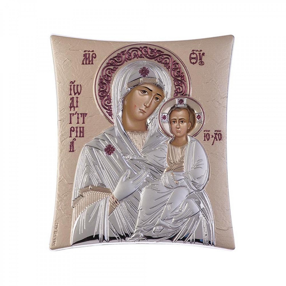 Ακριβές αντίγραφο Βυζαντινής εικόνας σε τετράγωνο σχήμα με την Παναγία Οδηγήτρια 16x20 cm, κατασκευασμένη από φιλμ ασημιού επί μεταλλικού υποστρώματος, το οποίο έχει υποστεί ειδική επεξεργασία για να παραμένει αναλλοίωτη στο χρόνο.