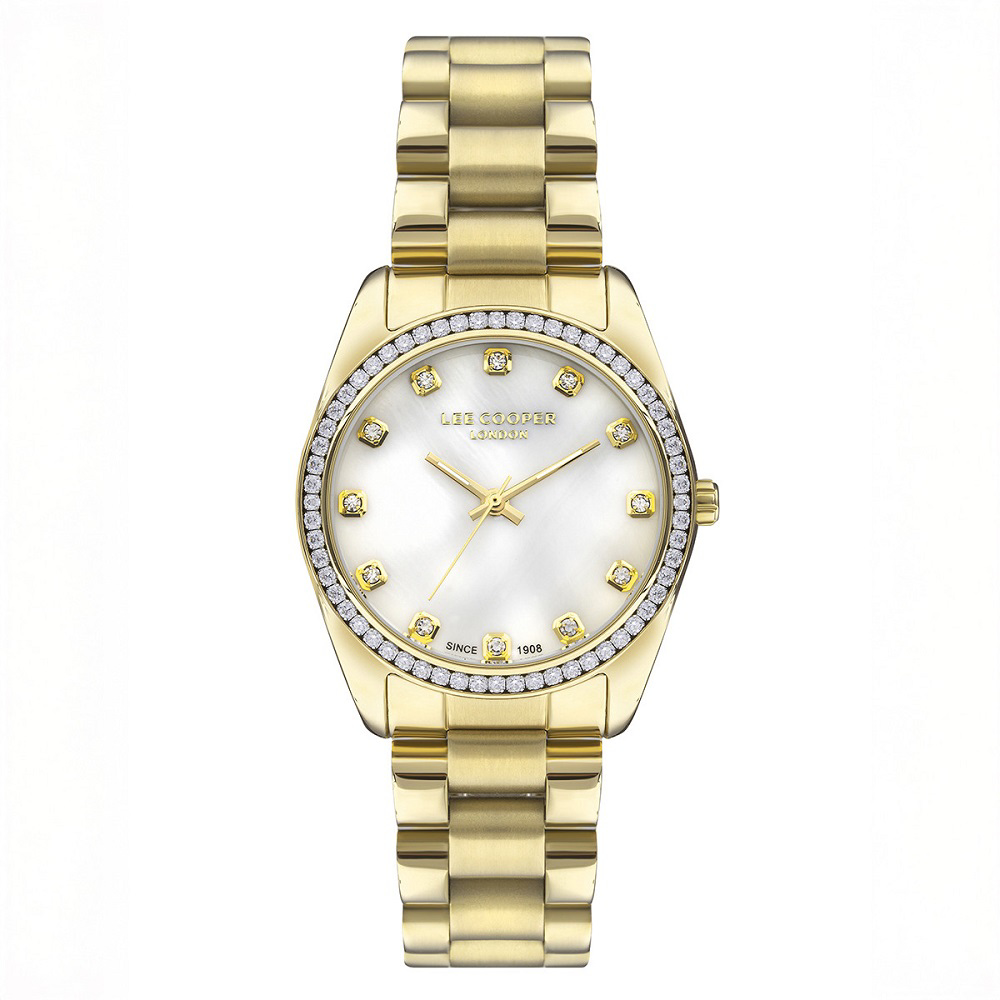 Γυναικείο ωρολόγι Lee Cooper, μοντέλο LC07478.120 με 34 mm κάσα από επιχρυσωμενο Super Metal, καντράν από όστρακο μαργαριταριού με πέτρες και μπρασελε απο επιχρυσωμένο ανοξείδωτο ατσάλι. Στεγανοποίηση 3 ATM (Πλύσιμο χεριών, επαφή με βροχή).