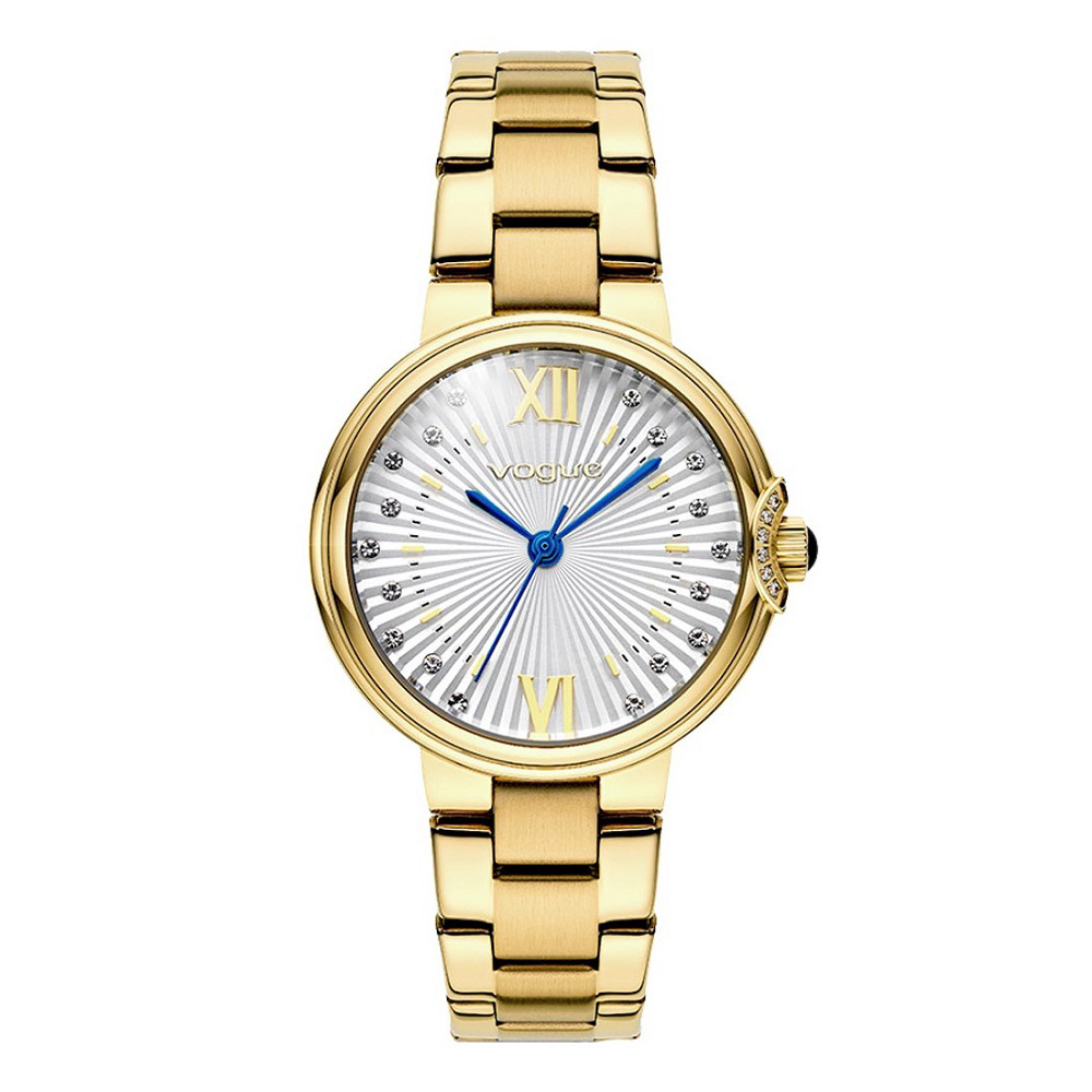 Γυναικείο ωρολόγι της εταιρίας VOGUE από τη συλλογή CARMEN MINI (κωδ. 616041) με ασημί καντράν και λευκά ζιργκόν, κάσα 32 mm, μπρασελέ από επιχρυσωμένο ανοξείδωτο ατσάλι και στεγανοποίηση 3 ΑΤΜ.
