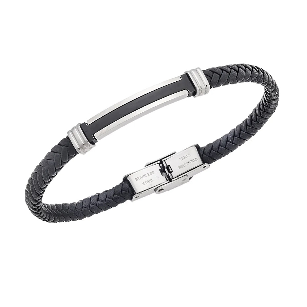 Ανδρικό βραχιόλι απο μαύρο δέρμα και μαύρο ανοξείδωτο αντιαλεργικό ατσάλι.