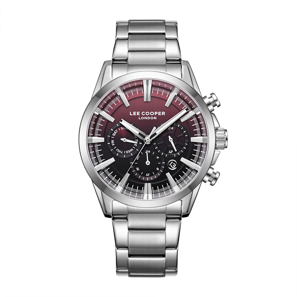 Ανδρικό ωρολόγι Lee Cooper πολλαπλών ενδείξεων (ημέρα-ημερομηνία-ένδειξη 24ώρου) μοντέλο LC08305.380 με 43 mm κάσα από Super Metal, βυσσινί καντράν και μπρασελέ από ανοξείδωτο ατσάλι. Στεγανοποίηση 5 ATM (τυχαία επαφή με νερό).