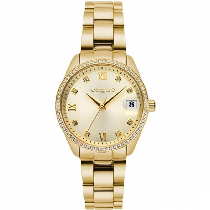 Γυναικείο ωρολόγι VOGUE από τη συλλογή REINA MINI (κωδ. 614344), με χρυσό καντραν, κάσα 27 mm και στεφάνη με λευκά ζιργκόν, ένδειξη ημερομηνίας και μπρασελέ από ανοξείδωτο επιχρυσωμένο ατσάλι.Στεγανοποίηση 10 ΑΤΜ.