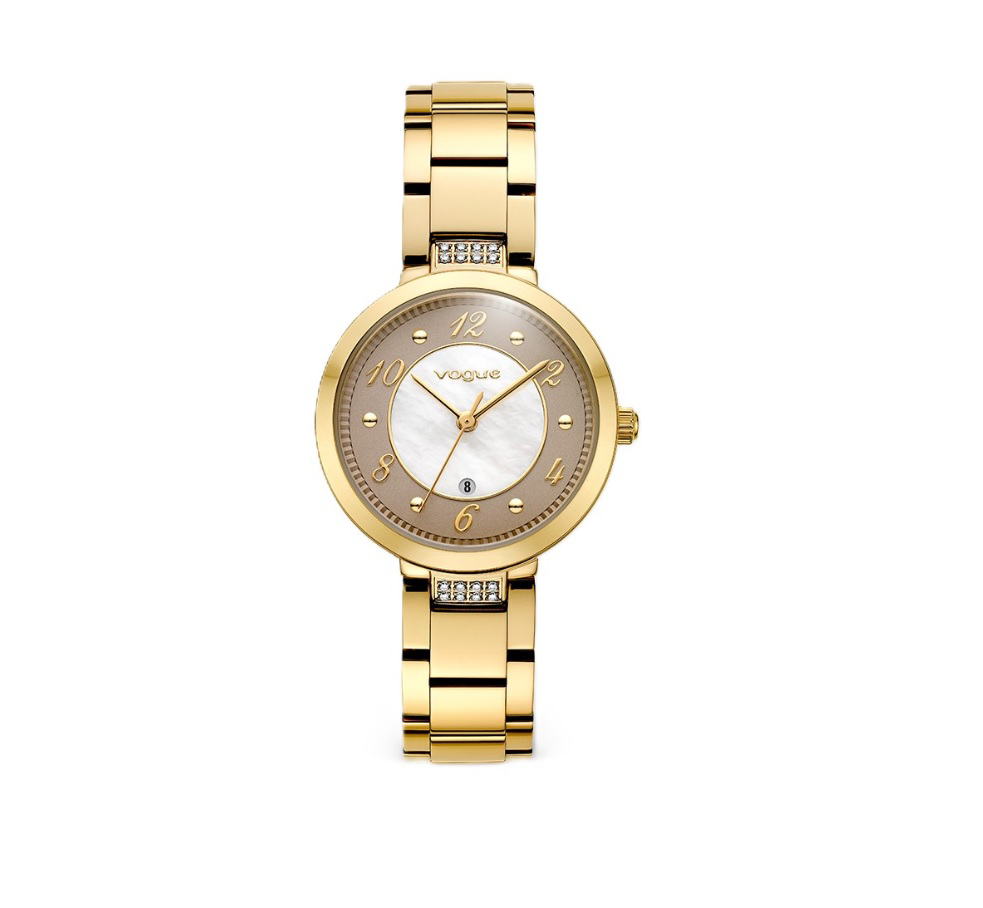 Γυναικείο ωρολόγι της εταιρίας VOGUE από τη συλλογή ZOE (κωδ. 616442) με καντράν από όστρακο μαργαριταριού και καφέ, λευκά ζιργκόν, κάσα 31 mm, μπρασελέ από επιχρυσωμένο ανοξείδωτο ατσάλι και στεγανοποίηση 5 ΑΤΜ.