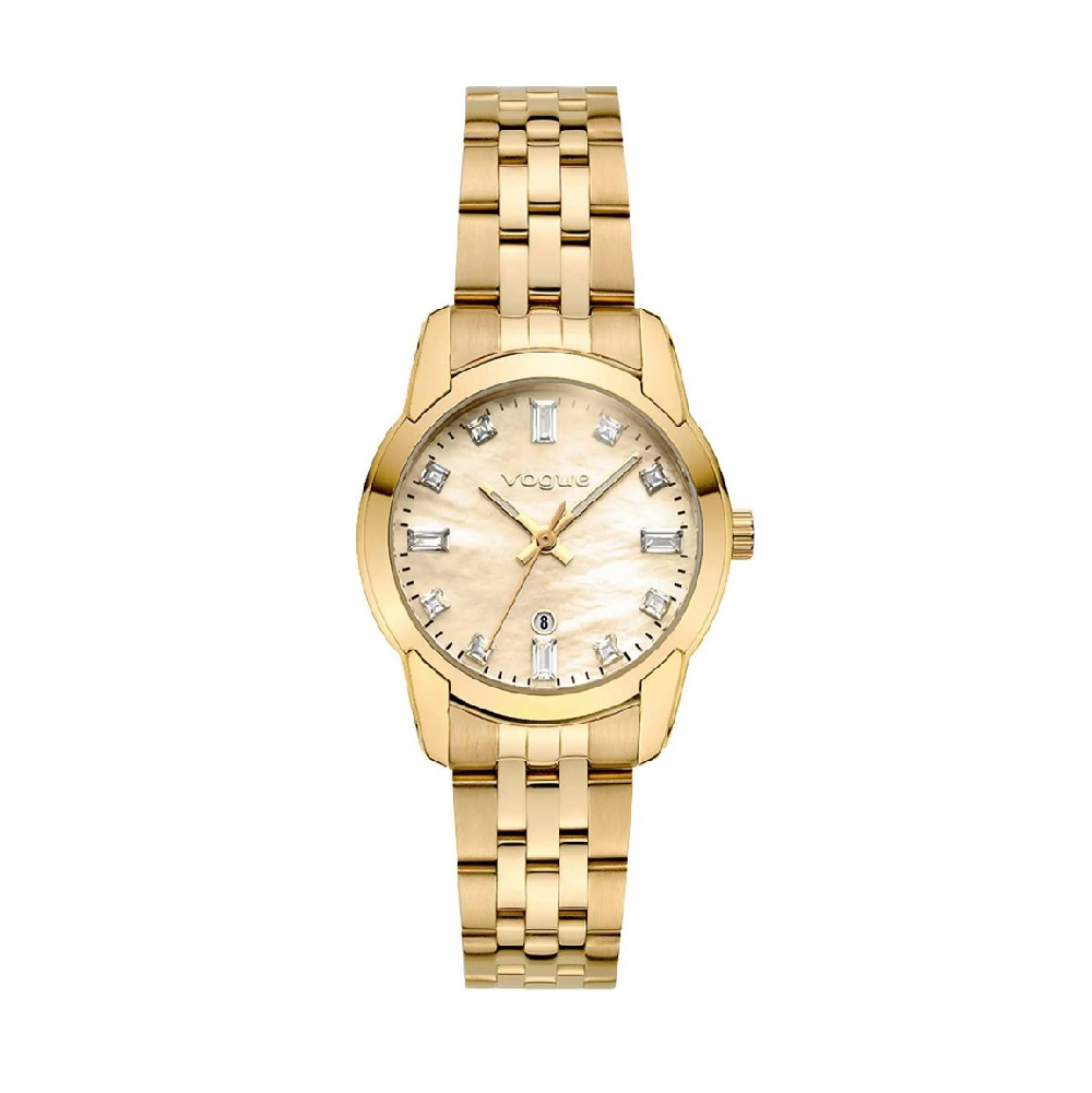 Γυναικείο ωρολόγι VOGUE από τη συλλογή LYDIA (κωδ. 616541), με καντραν από όστρακο μαργαριταριού λευκά ζιργκόν στις ενδείξεις της ώρας, κάσα 32 mm, ένδειξη ημερομηνίας και μπρασελέ από επιχρυσωμένο ανοξείδωτο ατσάλι.Στεγανοποίηση 5 ΑΤΜ.