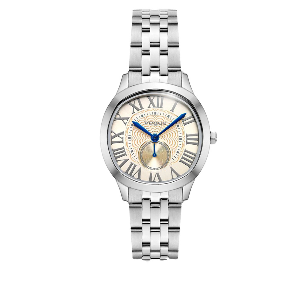 Γυναικείο ωρολόγι VOGUE από τη συλλογή YVONNE (κωδ. 616781), με χρυσό καντραν και μπλε δείκτες, κάσα 33 mm και μπρασελέ από ανοξείδωτο ατσάλι.Στεγανοποίηση 3 ΑΤΜ.