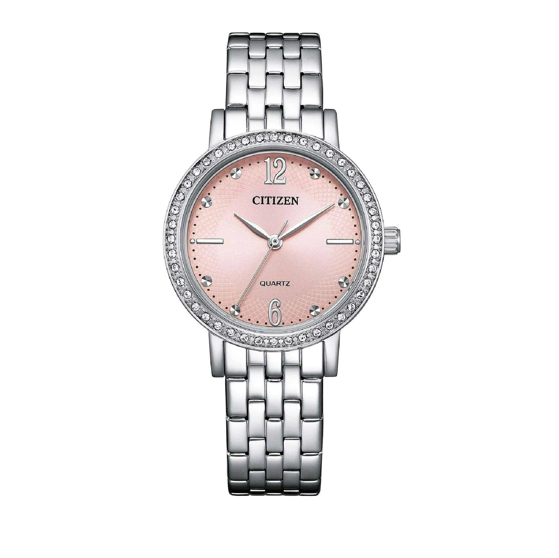 Ένα γυναικείο ωρολόγι CITIZEN από τη συλλογή ELEGANT (EL3102-50W), με μπρασελέ από ανοξείδωτο ατσάλι, στεφάνη με SWAROVSKI πέτρες και mother of pearl cadran. WR 5 ATM.