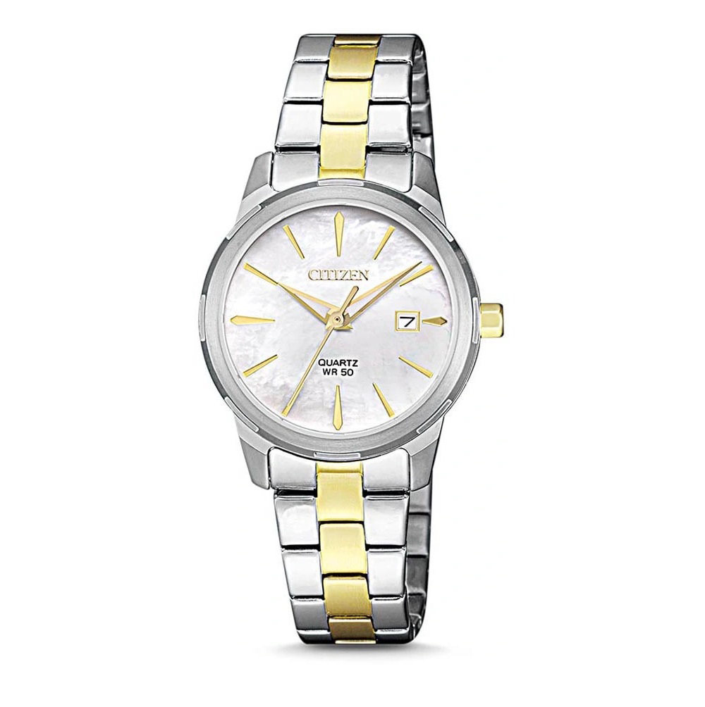 Ένα γυναικείο ωρολόγι CITIZEN, με μπρασελέ από λευκό και επιχρυσωμένο ανοξείδωτο ατσάλι. WR 50 ATM.