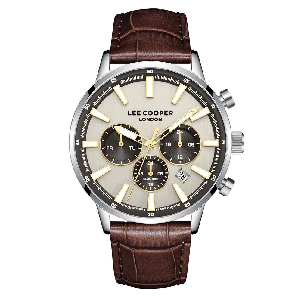 Ανδρικό ωρολόγι Lee Cooper πολλαπλών ενδείξεων (ημέρα-ημερομηνία-ένδειξη 24ώρου-διπλή ώρα) μοντέλο LC08401.362 με 42mm κάσα από Super Metal, ασημί καντράν και καφέ δερμάτιο λουράκι. WR 5 ATM (Κρύο ντους, επιφανειακή κολύμβηση).