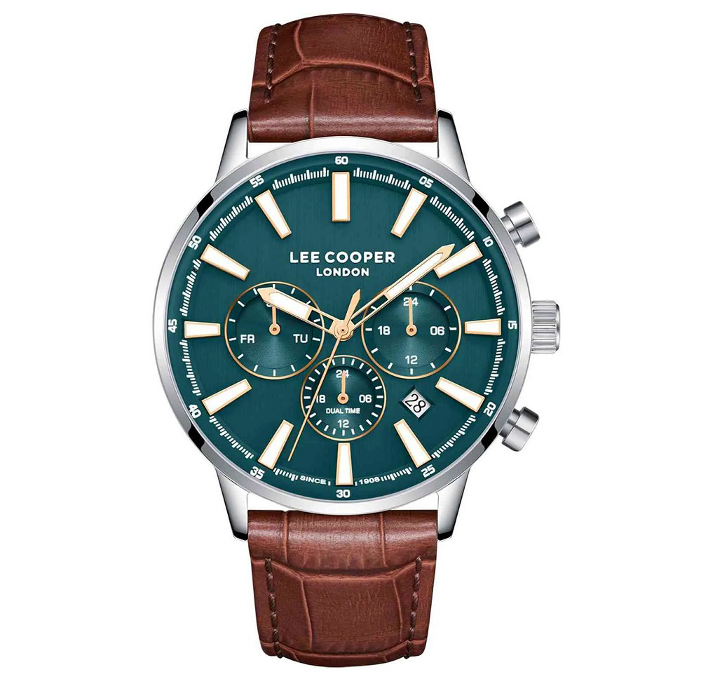 Ανδρικό ωρολόγι Lee Cooper πολλαπλών ενδείξεων (ημέρα-ημερομηνία-ένδειξη 24ώρου-διπλή ώρα) μοντέλο LC08401.392 με 42mm κάσα από Super Metal, πραάσινο καντράν και καφέ δερμάτιο λουράκι. WR 5 ATM (Κρύο ντους, επιφανειακή κολύμβηση).
