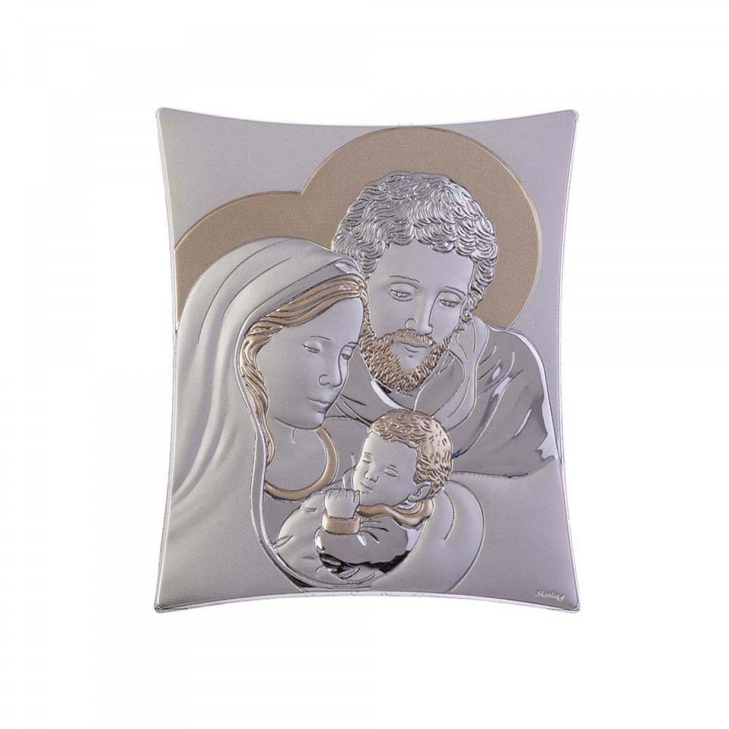 Ακριβές αντίγραφο Βυζαντινής εικόνας σε τετράγωνο σχήμα με την Αγία Οικογένεια 16x20 cm, κατασκευασμένη από φιλμ ασημιού επί μεταλλικού υποστρώματος, το οποίο έχει υποστεί ειδική επεξεργασία για να παραμένει αναλλοίωτη στο χρόνο.