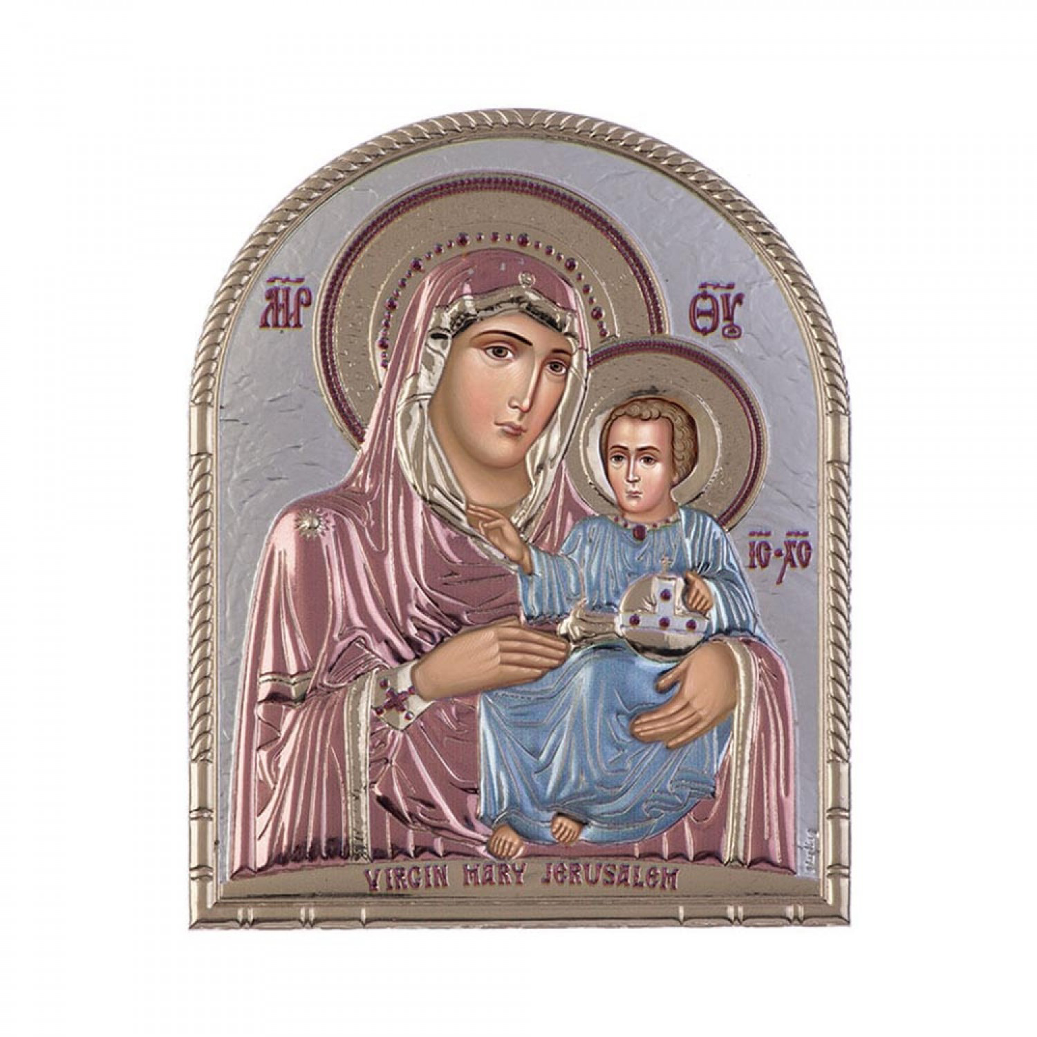 Ακριβές αντίγραφο Βυζαντινής εικόνας σε οβάλ σχήμα της Παναγίας της Ιεροσολυμίτισσας, 12x15 cm, κατασκευασμένη από φιλμ ασημιού επί μεταλλικού υποστρώματος, το οποίο έχει υποστεί ειδική επεξεργασία για να παραμένει αναλλοίωτη στο χρόνο.