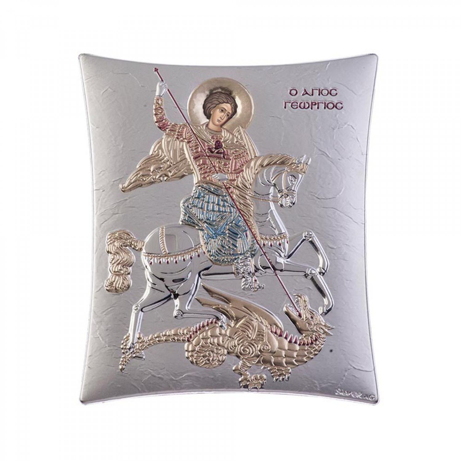 Ακριβές αντίγραφο Βυζαντινής εικόνας σε τετράγωνο σχήμα του Αγίου Γεωργίου 16χ20 cm με μεταξοτυπία, κατασκευασμένη από φιλμ ασημιού επί μεταλλικού υποστρώματος, το οποίο έχει υποστεί ειδική επεξεργασία για να παραμένει αναλλοίωτη στο χρόνo.