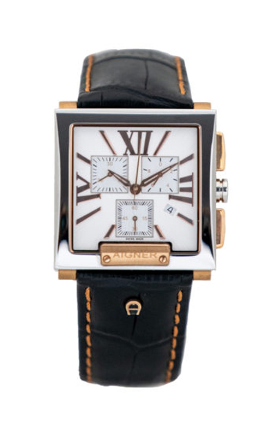 Ένα εξαιρετικό ανδρικό ελβετικό ωρολόγι χρονογράφος AIGNER της συλλογής TORINO μοντέλο A27113, τετράγωνη κάσα 41 mm από IP ανοξείδωτο ατσάλι, λεύκη πλάκα, ζαφείρι κρύσταλλο και στεφάνι με μπρονζέ λογότυπο, καφέ δερμάτινο λουράκι.
